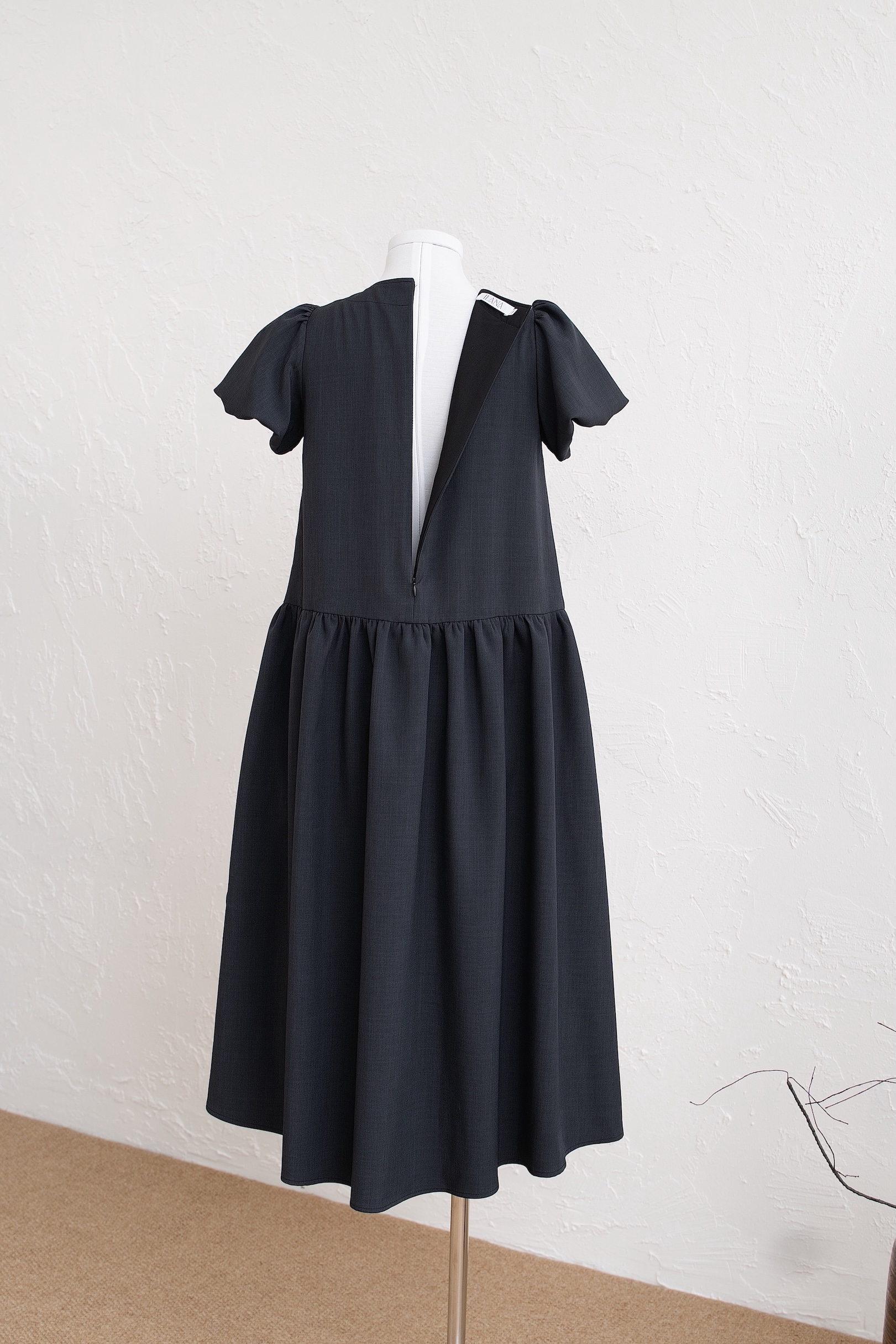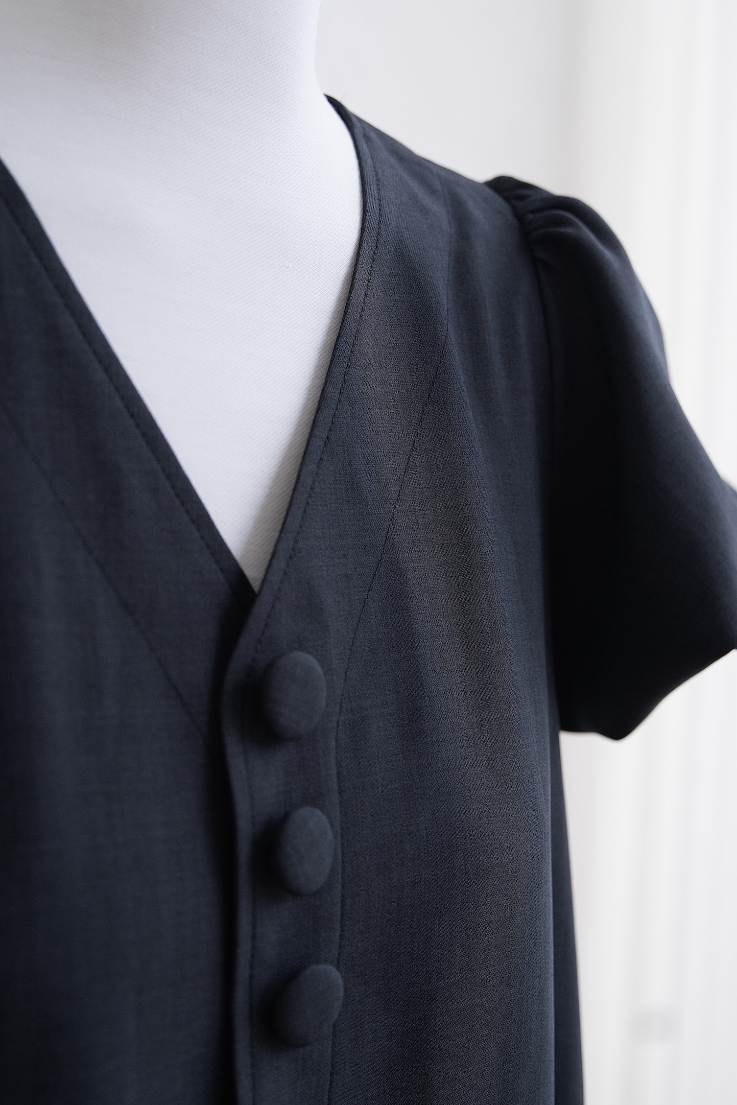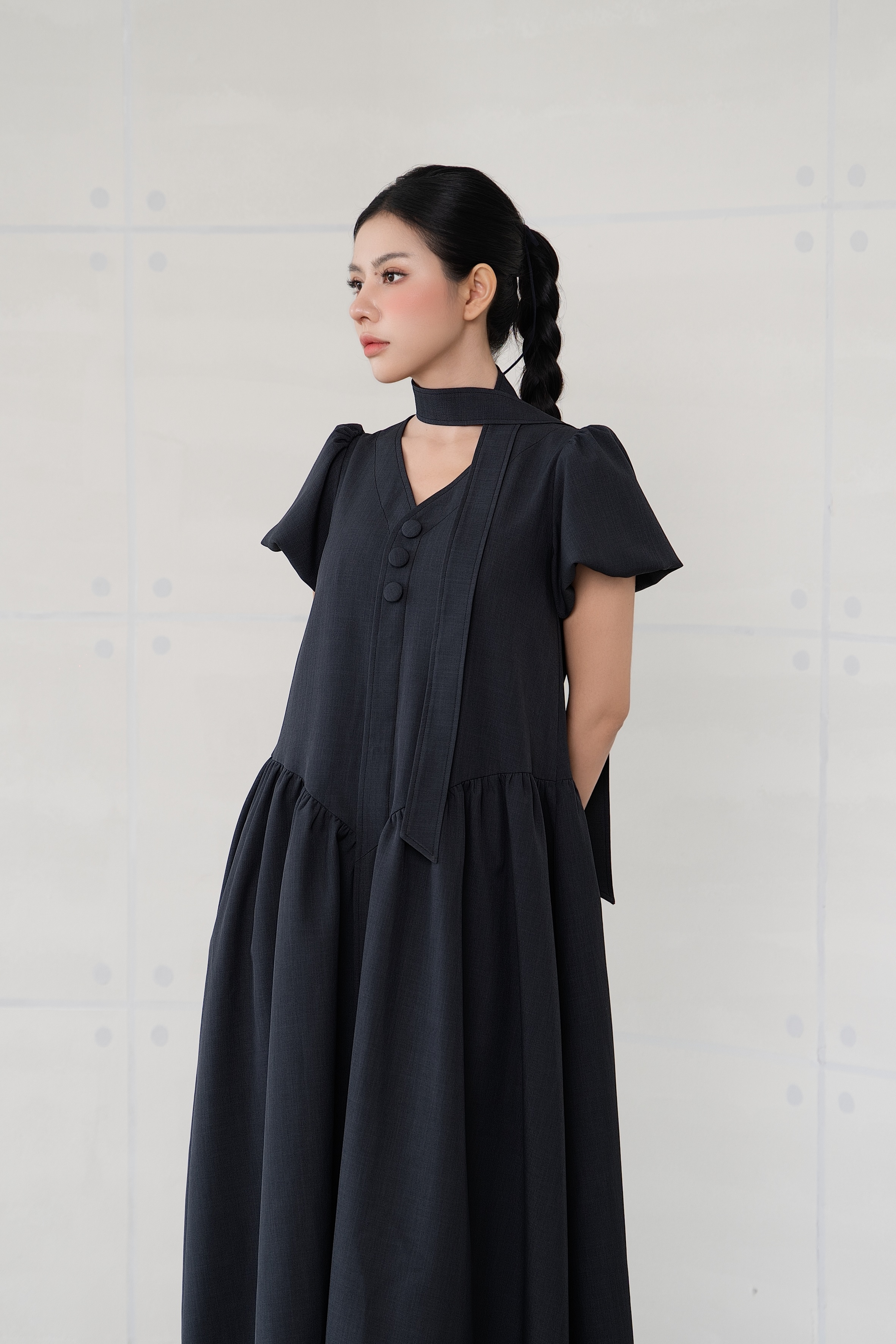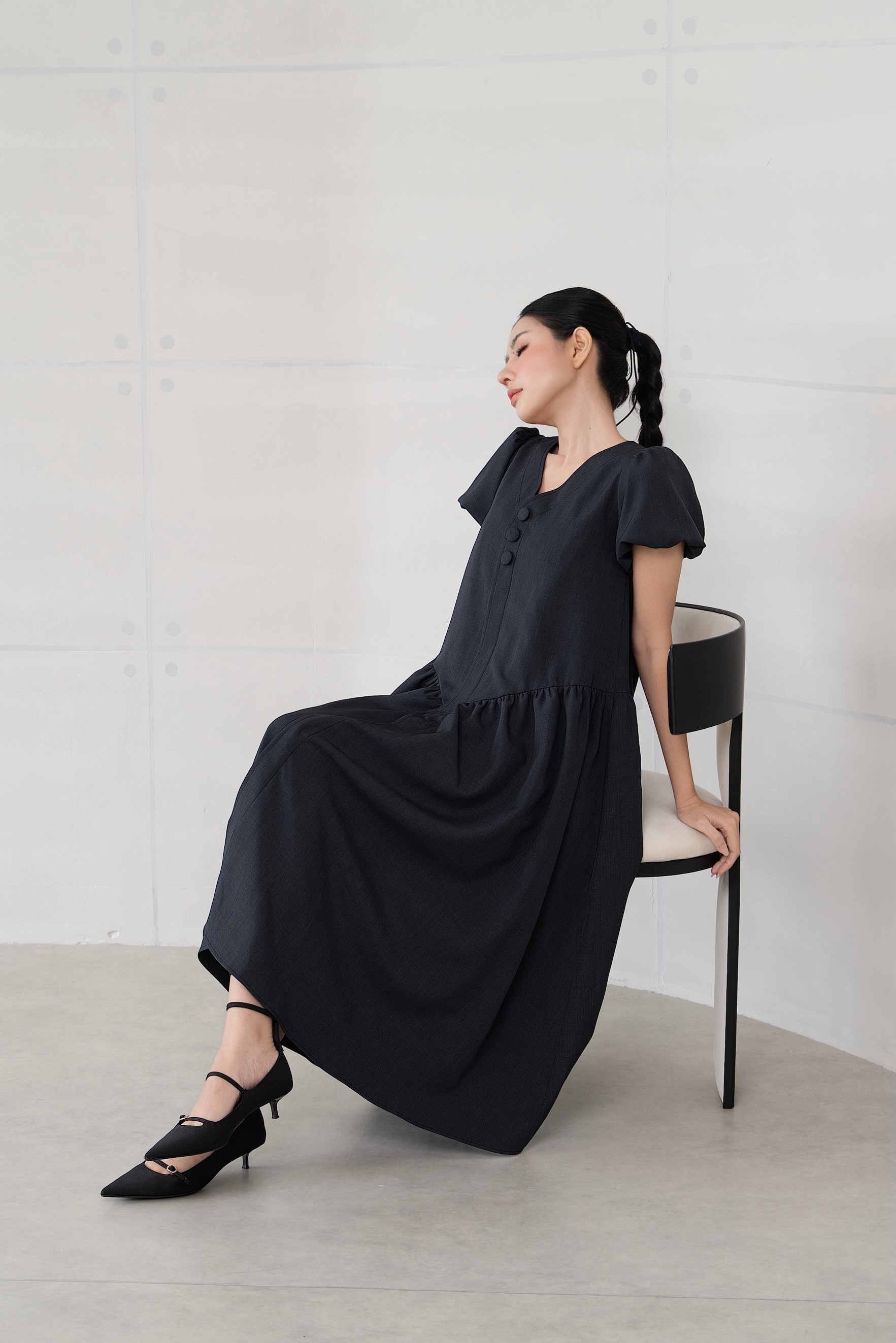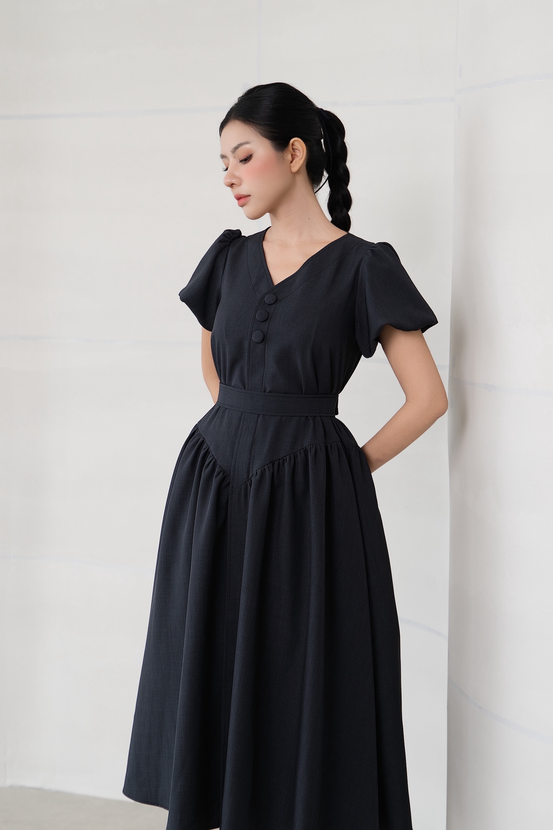 Đầm babydoll cổ tim tay phồng đính 3 nút trước ngực kèm dây buộc eo có túi Adela Dress.