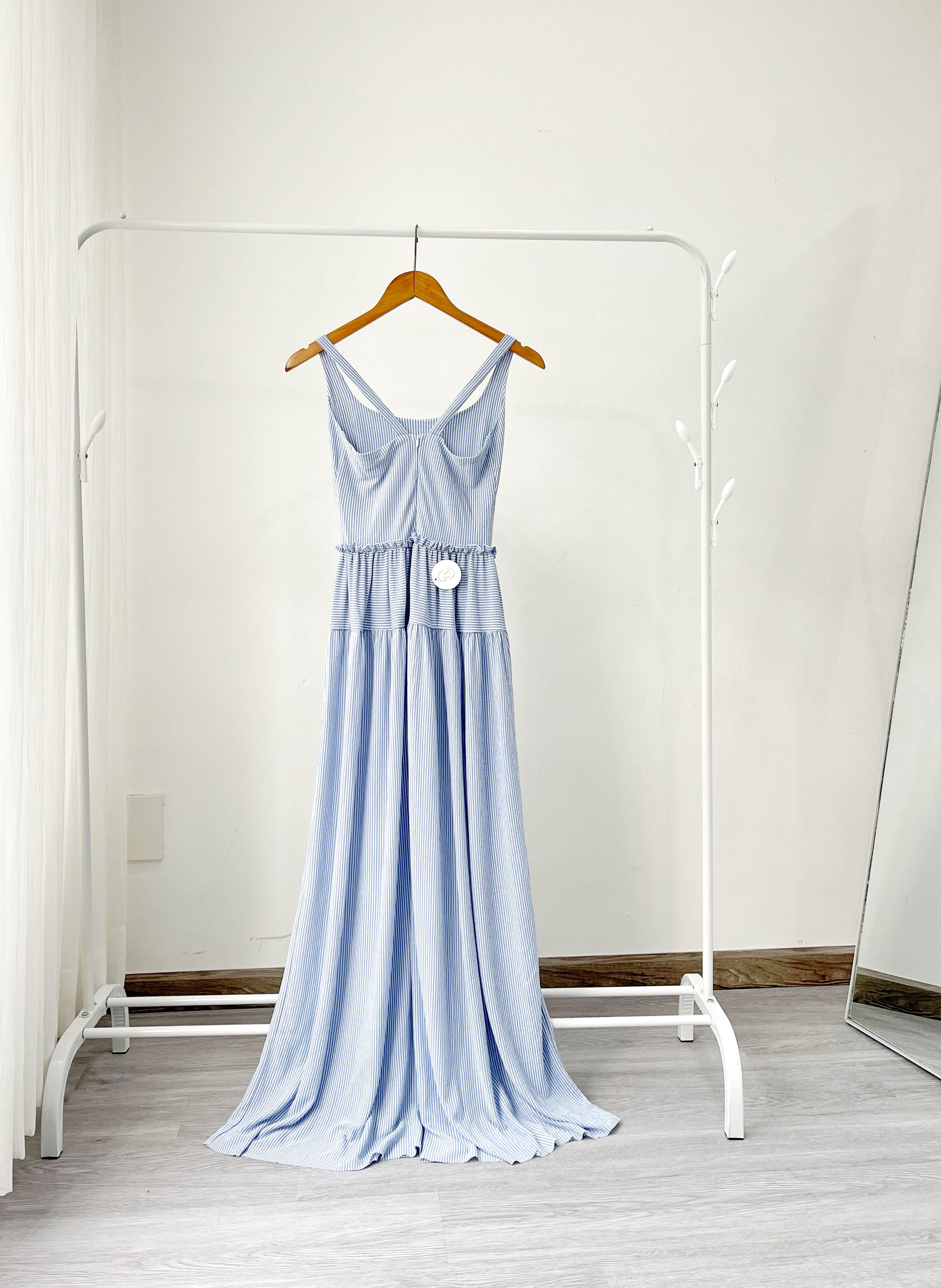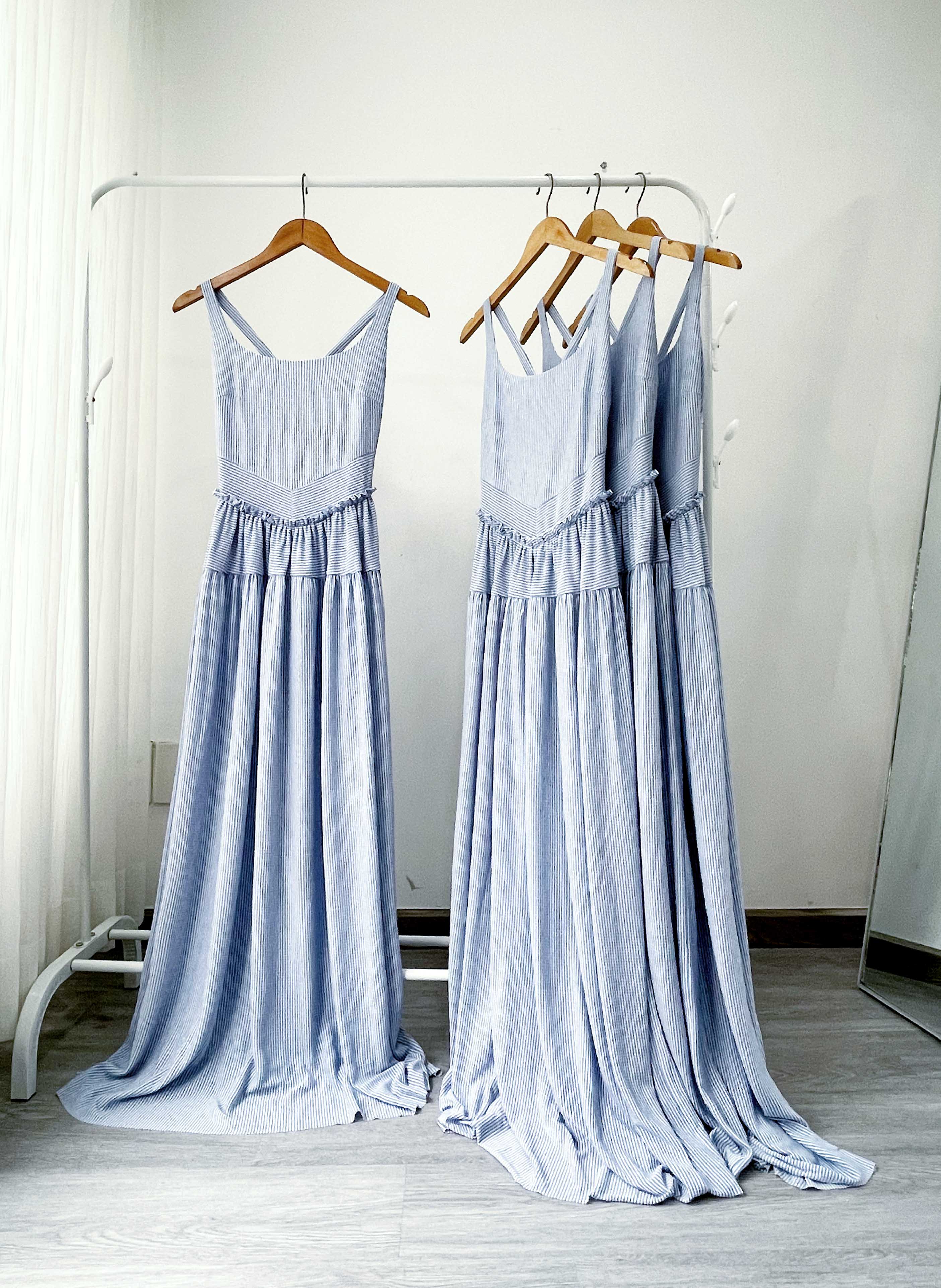 đầm thun maxi sọc xanh biển nhẹ cổ vuông sát nách