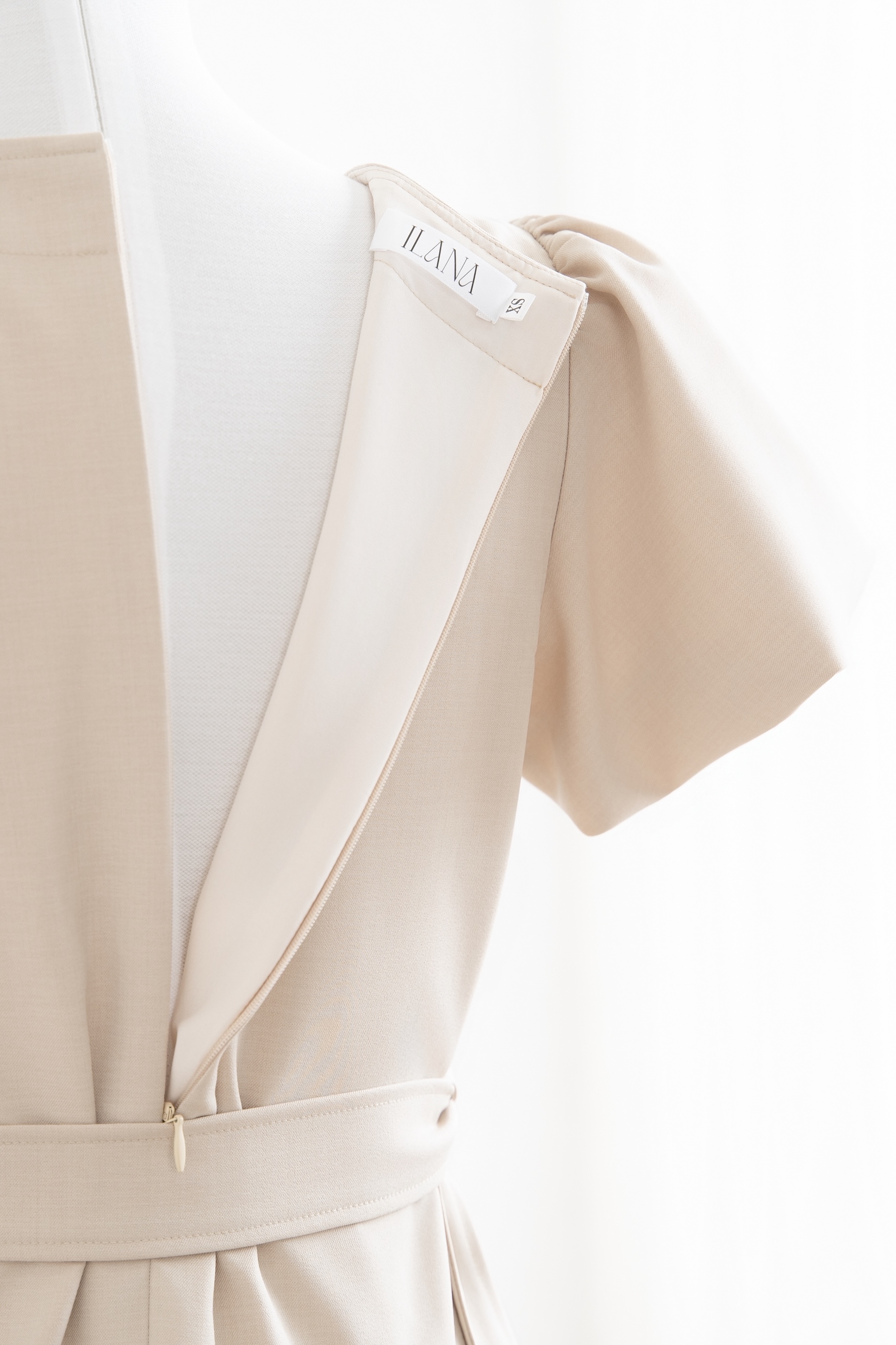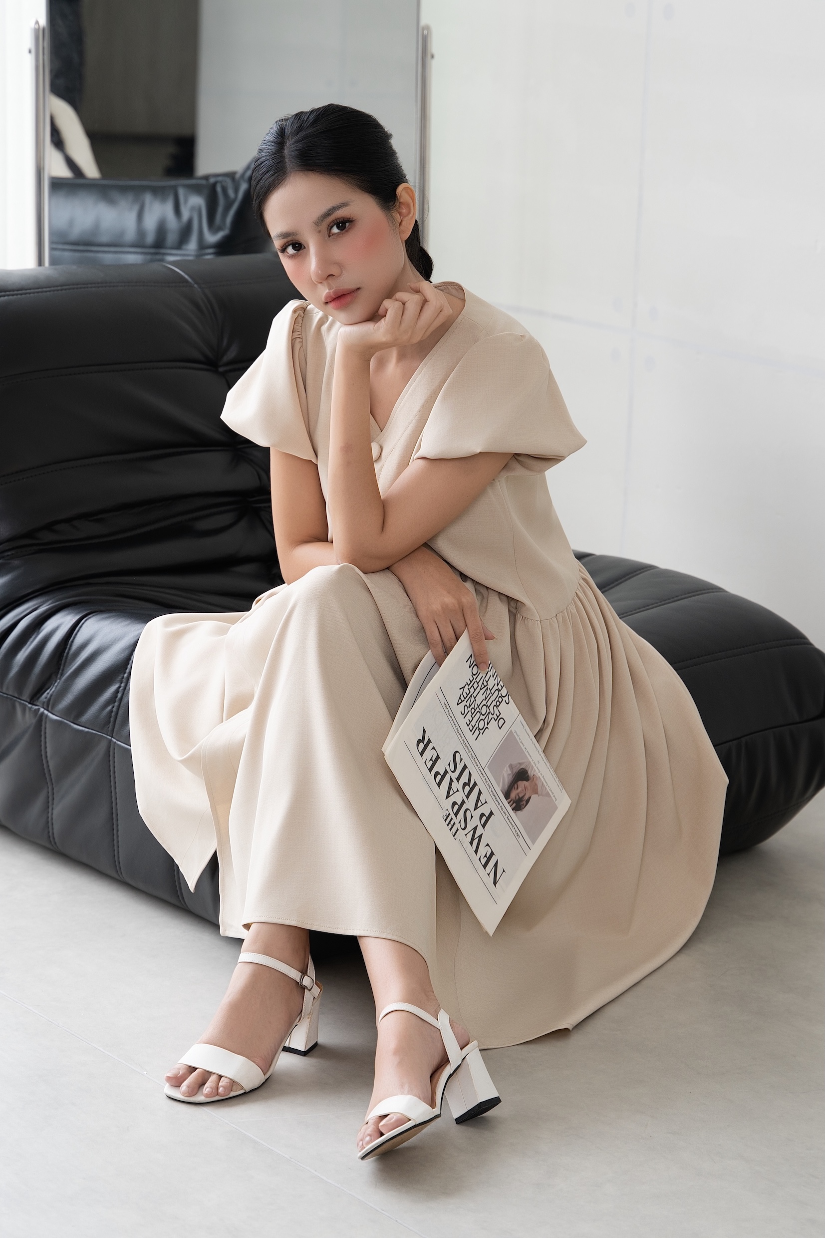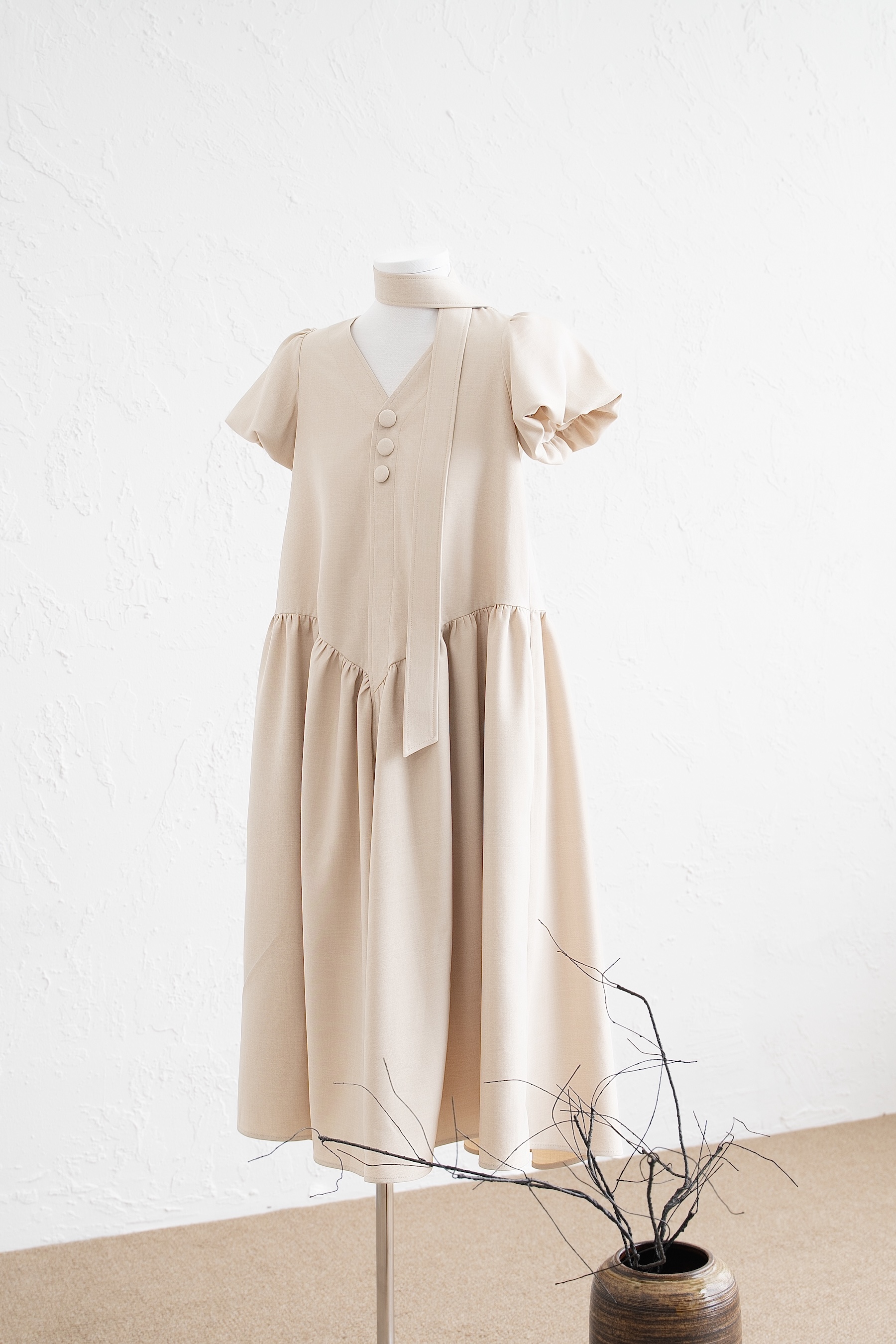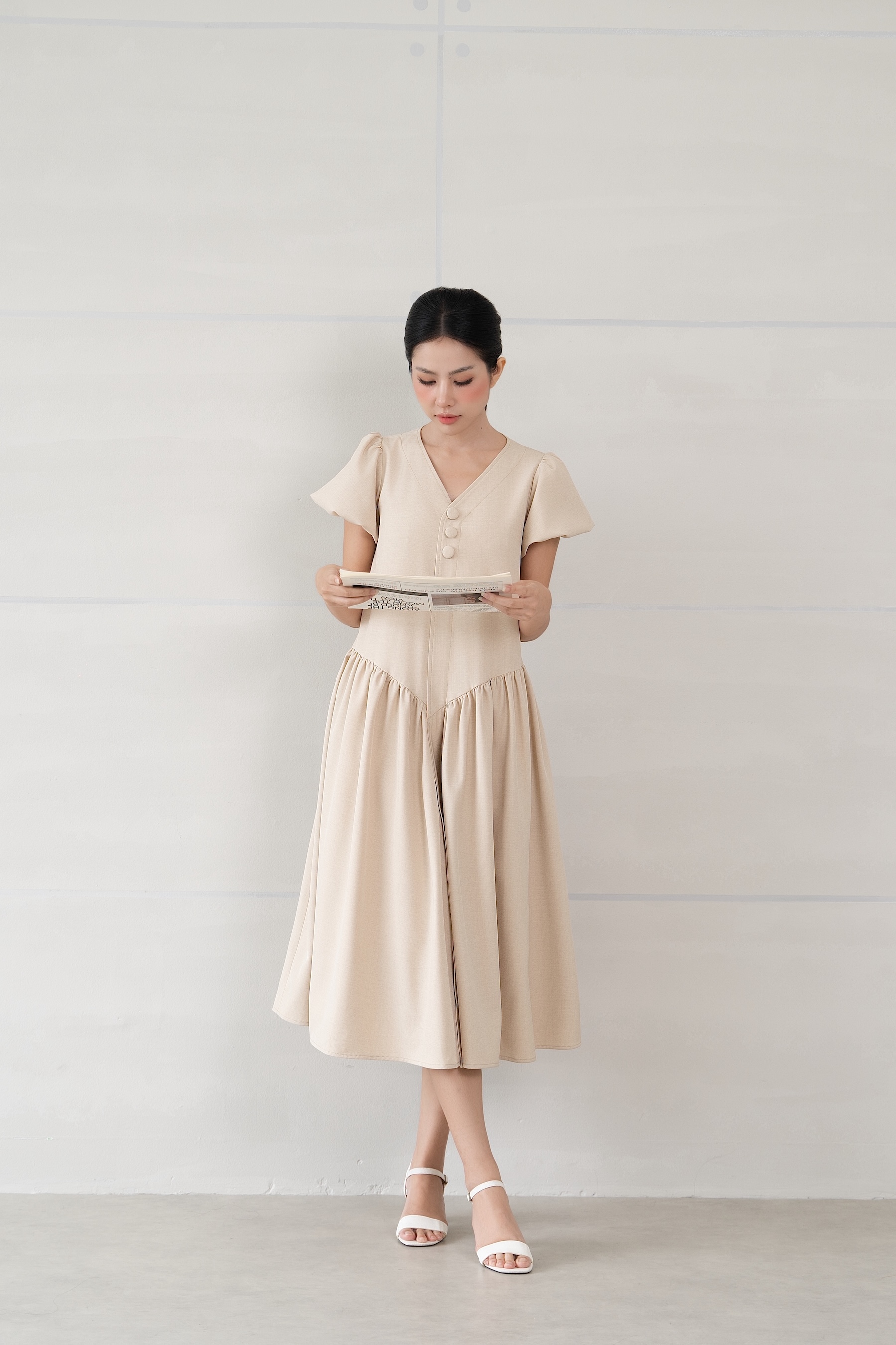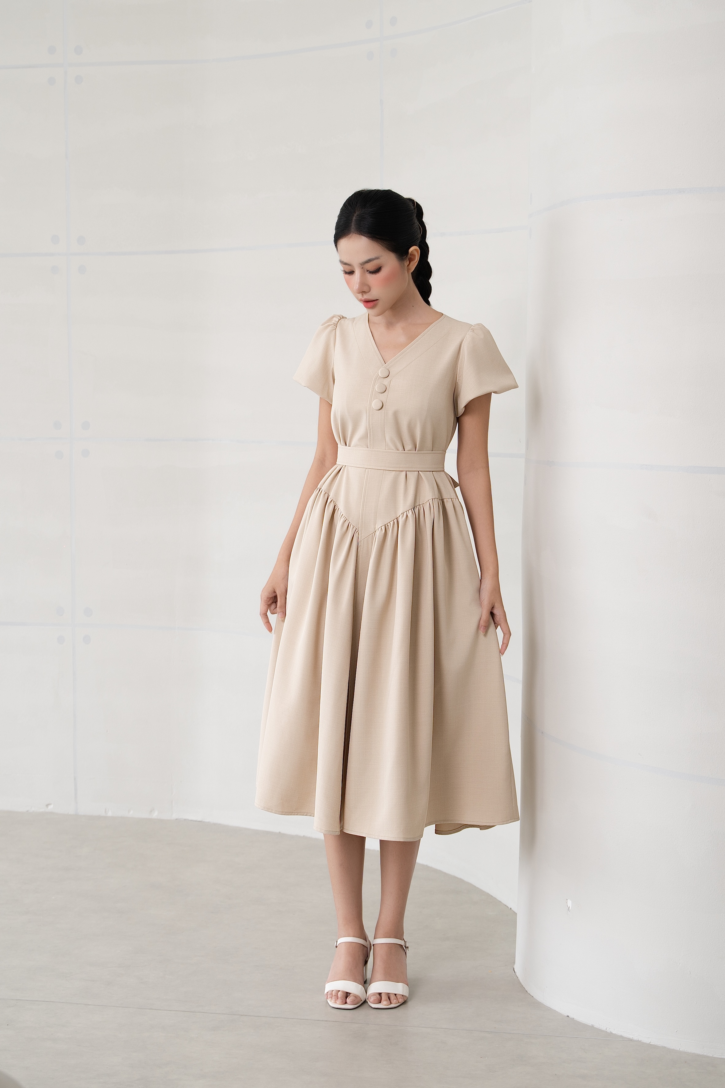 Đầm babydoll cổ tim tay phồng đính 3 nút trước ngực kèm dây buộc eo có túi sườn màu kem nhạt (latte)